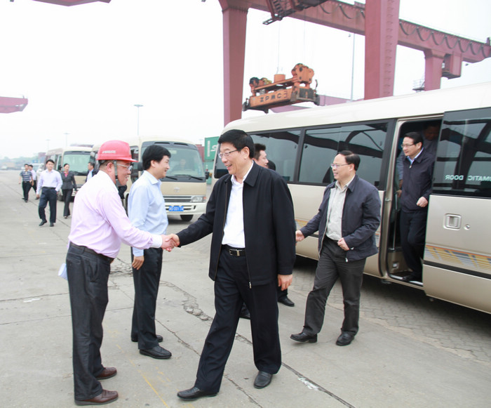 5月3日下午,湖南省委書記徐守盛,省委常委、省委秘書長易煉紅,及省信訪局、省發(fā)改委、省經(jīng)信委、省民政廳、省公安廳、省政府辦公廳等領(lǐng)導(dǎo)一行,在長沙市委副書記、市長張劍飛,市委副書記張迎龍,市委常委、市委秘書長李軍,開福區(qū)區(qū)委書記李蔚,區(qū)委副書記、區(qū)長廖建華,金霞開發(fā)區(qū)黨工委書記張毅,黨工委副書記、管委會主任袁政國等領(lǐng)導(dǎo)的陪同下來長沙新港考察調(diào)研。湖南長沙新港有限責(zé)任公司董事長、總經(jīng)理唐忠良,董事、財務(wù)總監(jiān)趙赤書,董事、副總經(jīng)理張韜,董事、長沙集星集裝箱碼頭有限公司副總經(jīng)理辛華等公司領(lǐng)導(dǎo)接待。