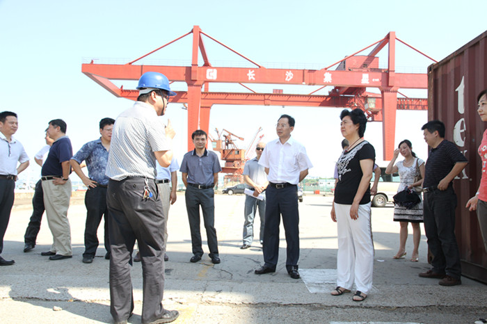 圖為長(zhǎng)沙集星集裝箱碼頭有限公司總經(jīng)理助理周勇(前左一)在向長(zhǎng)沙市政協(xié)黨組副書(shū)記、副主席鐘新蓮(前右一)、長(zhǎng)沙市開(kāi)福區(qū)區(qū)委書(shū)記李蔚(前右二)介紹長(zhǎng)沙新港目前的集裝箱業(yè)務(wù)情況。 2013年7月11日上午,長(zhǎng)沙市政協(xié)黨組副書(shū)記、副主席鐘新蓮在長(zhǎng)沙市開(kāi)福區(qū)區(qū)委書(shū)記李蔚的陪同下,就現(xiàn)代物流業(yè)發(fā)展情況來(lái)長(zhǎng)沙新港視察調(diào)研。湖南長(zhǎng)沙新港有限責(zé)任公司董事、財(cái)務(wù)總監(jiān)趙赤書(shū),長(zhǎng)沙集星集裝箱碼頭有限公司總經(jīng)理助理周勇出席接待。鐘新蓮副主席對(duì)港口建設(shè)及港口目前的發(fā)展情況等一系列問(wèn)題進(jìn)行了深入考察。 |