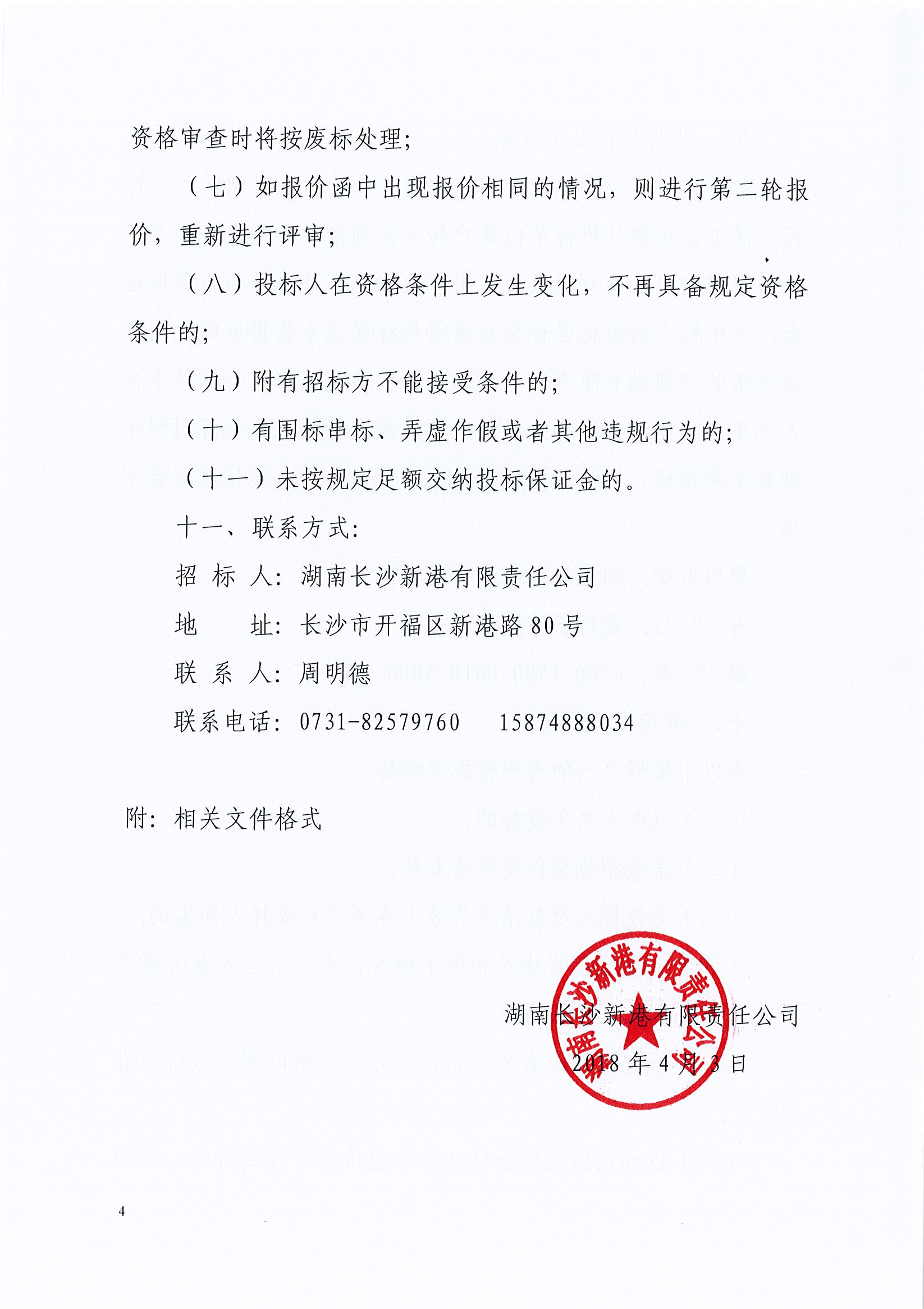 我公司決定對港區(qū)內(nèi)散貨裝卸中轉(zhuǎn)業(yè)務(wù)外包項(xiàng)目按照一般競爭性談判方式選擇外包單位,歡迎符合條件的單位參與項(xiàng)目的競爭談判。 一、 項(xiàng)目名稱:湖南長沙新港有限責(zé)任公司港區(qū)內(nèi)散貨裝卸中轉(zhuǎn)業(yè)務(wù)外包項(xiàng)目 二、 項(xiàng)目內(nèi)容: 長沙新港港區(qū)內(nèi):①散貨裝車(含清底);②散貨船舶機(jī)械清倉;③場內(nèi)散貨打堆、裝車、清底、中轉(zhuǎn)運(yùn)輸。 三、 項(xiàng)目委托期限:自簽訂合同之日起壹年。 四、 資格及資質(zhì)要求: (一)本項(xiàng)目不接受聯(lián)合體投標(biāo); (二)投標(biāo)人須自有大鏟車、小鏟車、轉(zhuǎn)運(yùn)自卸車輛,能保證我司兩條生產(chǎn)作業(yè)線同時(shí)作業(yè); (三)投標(biāo)人鏟車司機(jī)、車隊(duì)司機(jī)須持有相關(guān)職業(yè)資格證; (四)投標(biāo)人遞交響應(yīng)文件時(shí)須提交以下證明材料(復(fù)印件需加蓋公章): 1.企業(yè)法人營業(yè)執(zhí)照副本復(fù)印件; 2.法人資格證明書或具有單位公章及法定代表人簽章的授權(quán)委托書、法人身份證原件(或復(fù)印件); 3.投標(biāo)人自有車輛購置證明材料、司機(jī)職業(yè)資格證明材料復(fù)印件; 4.投標(biāo)人類似項(xiàng)目業(yè)績證明材料; 5.投標(biāo)人身份證原件及復(fù)印件。 五、招標(biāo)文件的獲取方式:招標(biāo)文件見本公告附件,投標(biāo)人在投標(biāo)截止時(shí)間前可自行下載或前往我司515室領(lǐng)取。 六、遞交響應(yīng)文件截止時(shí)間(及談判時(shí)間)和地點(diǎn): (一)遞交響應(yīng)文件的截止時(shí)間:2018年4月9日上午9:30。 (二)遞交文件及談判地點(diǎn):新港公司一樓北會議室。 (三)法人代表或授權(quán)人代表需準(zhǔn)時(shí)到會,出示身份證原件(授權(quán)人代表需出示授權(quán)委托書)并簽名以示出席,否則,其投標(biāo)文件將被拒收。 (四)逾期送達(dá)或者不按談判文件要求密封的響應(yīng)文件,將拒絕接收。 七、招 標(biāo) 方:湖南長沙新港有限責(zé)任公司 聯(lián) 系 人:周明德 聯(lián)系電話: 15874888034 2018年4月3日 附件: