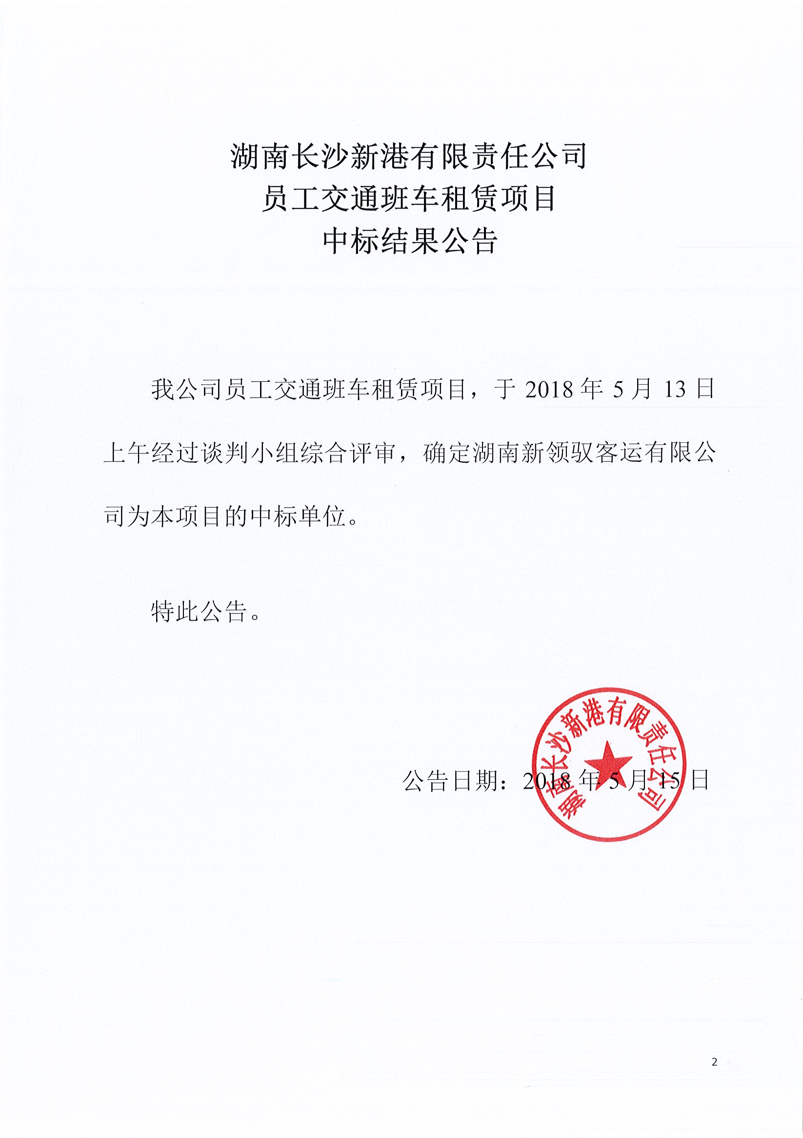 湖南長(zhǎng)沙新港有限責(zé)任公司 員工交通班車租賃項(xiàng)目中標(biāo)結(jié)果公告