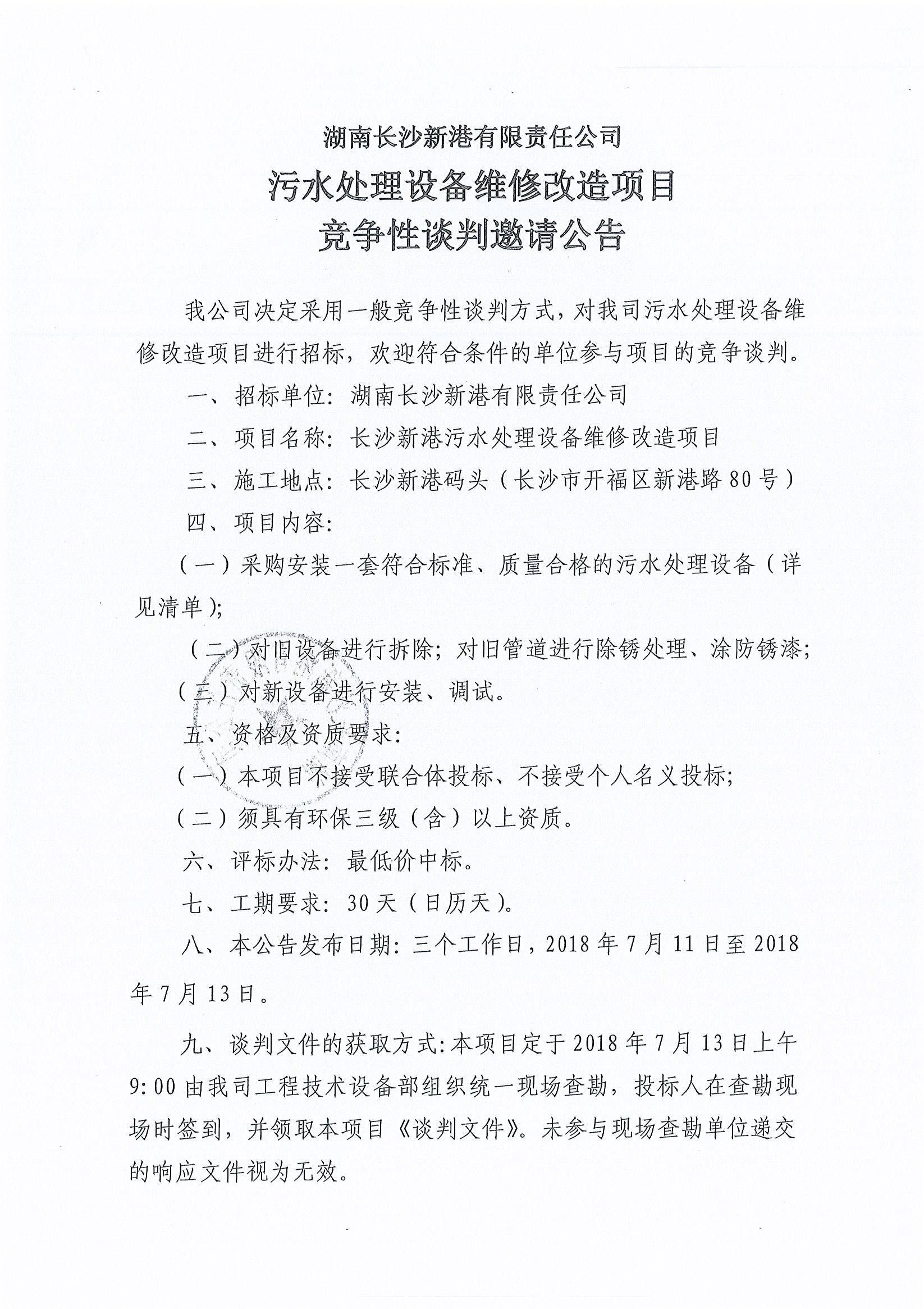 湖南長沙新港有限責(zé)任公司 污水處理設(shè)備維修項(xiàng)目競爭性談判邀請公告