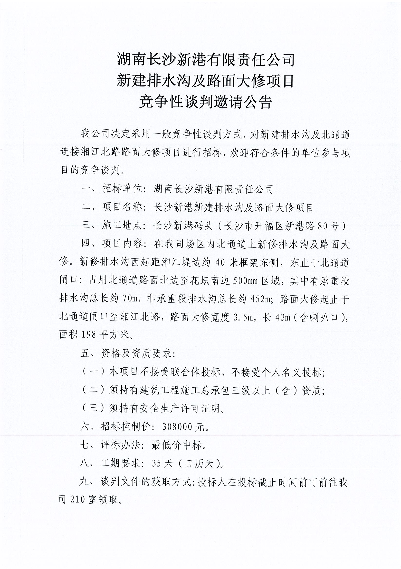 湖南長沙新港有限責(zé)任公司 新建排水溝及路面大修項目競爭性談判邀請公告