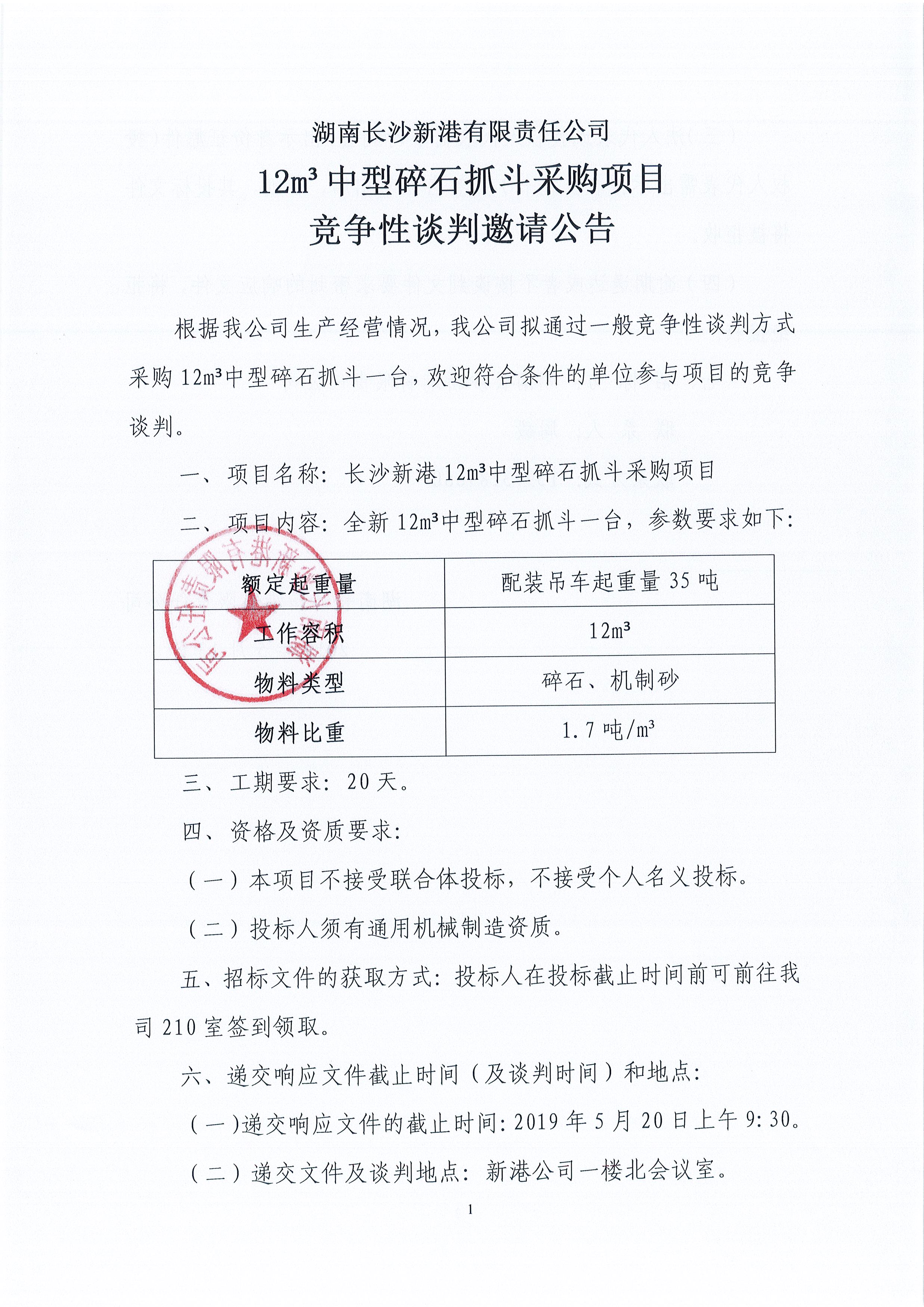 湖南長沙新港有限責(zé)任公司12立方中型礦石抓斗采購項(xiàng)目一般競爭性談判邀請公告